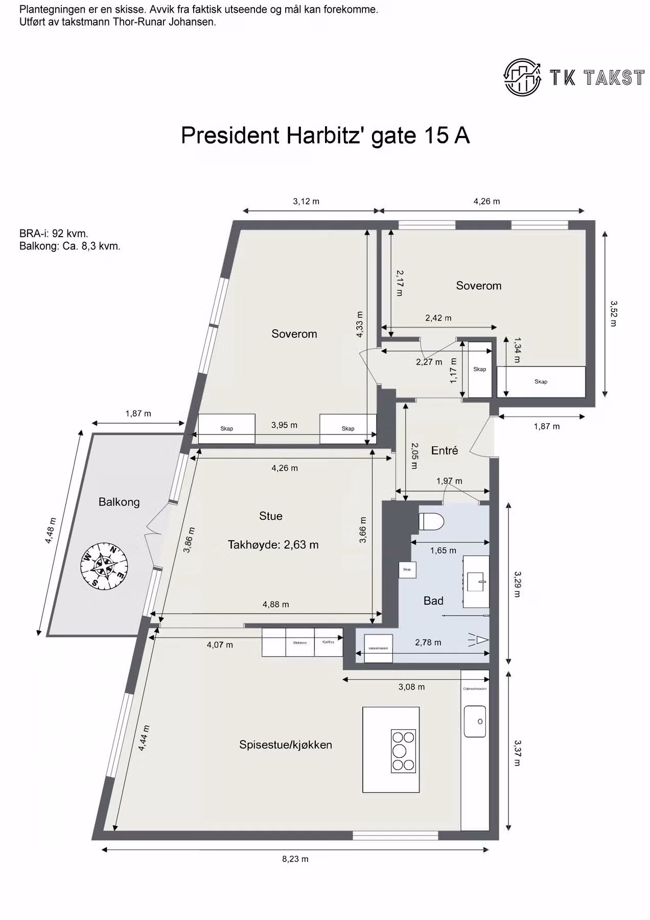 Romfordelingen består av entré/gang, stue, spisekjøkken, 2 soverom og bad. Balkong mot vest på ca 8 kvm.
